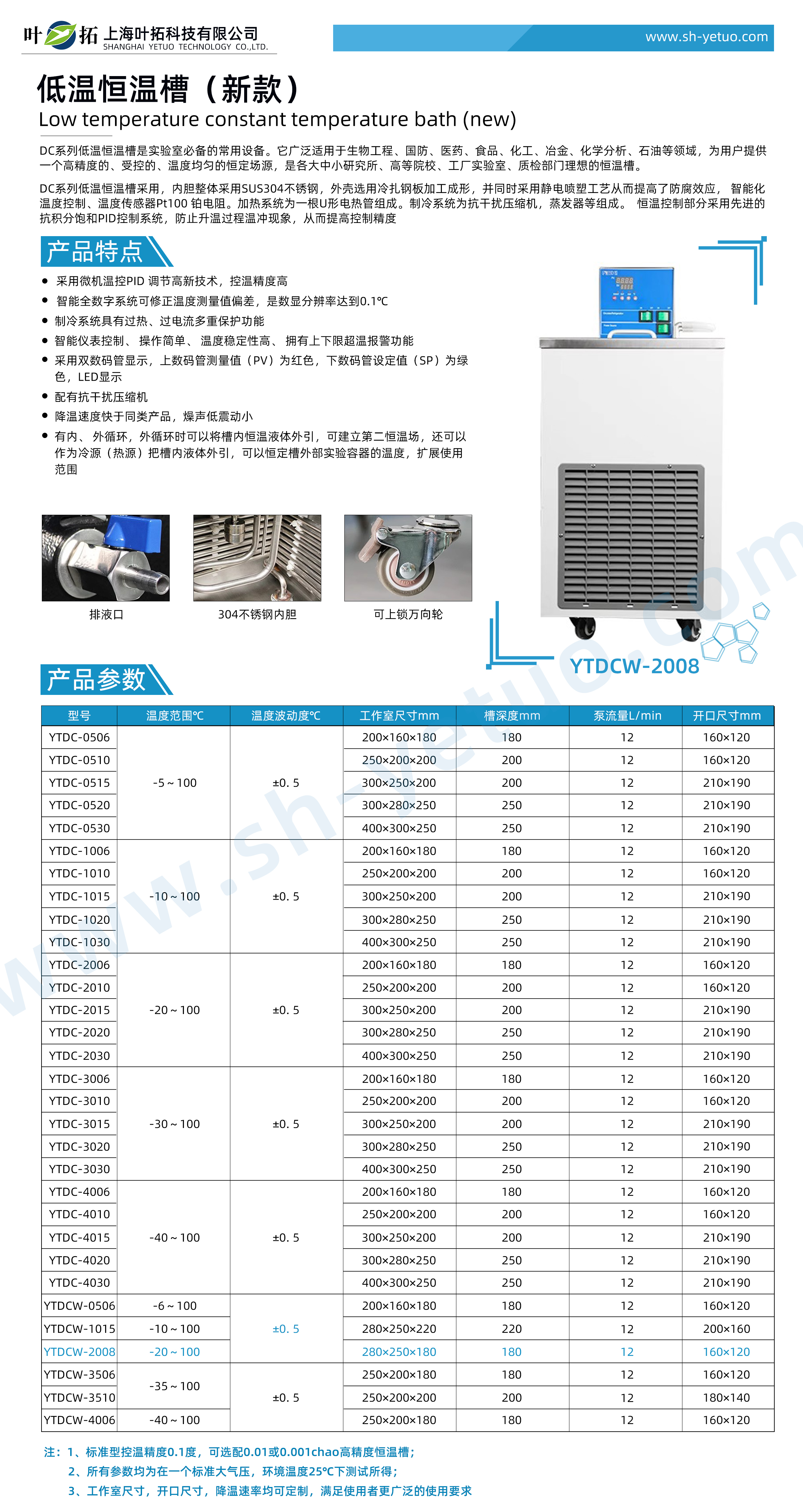 The DC series low-temperature constant temperature bath adopts SUS304 stainless steel as the overall inner liner, and the outer shell is processed and formed with high-quality cold rolled steel plate. At the same time, the electrostatic spraying process is used to improve the anti-corrosion effect, and intelligent temperature control and temperature sensor Pt100 platinum resistance are used. The heating system is composed of a high-efficiency U-shaped electric heating tube. The refrigeration system is composed of a fully efficient anti-interference compressor, evaporator, etc. The constant temperature control part adopts an internationally advanced anti integral saturation PID control system to prevent temperature surge during the heating process, thereby improving control accuracy.