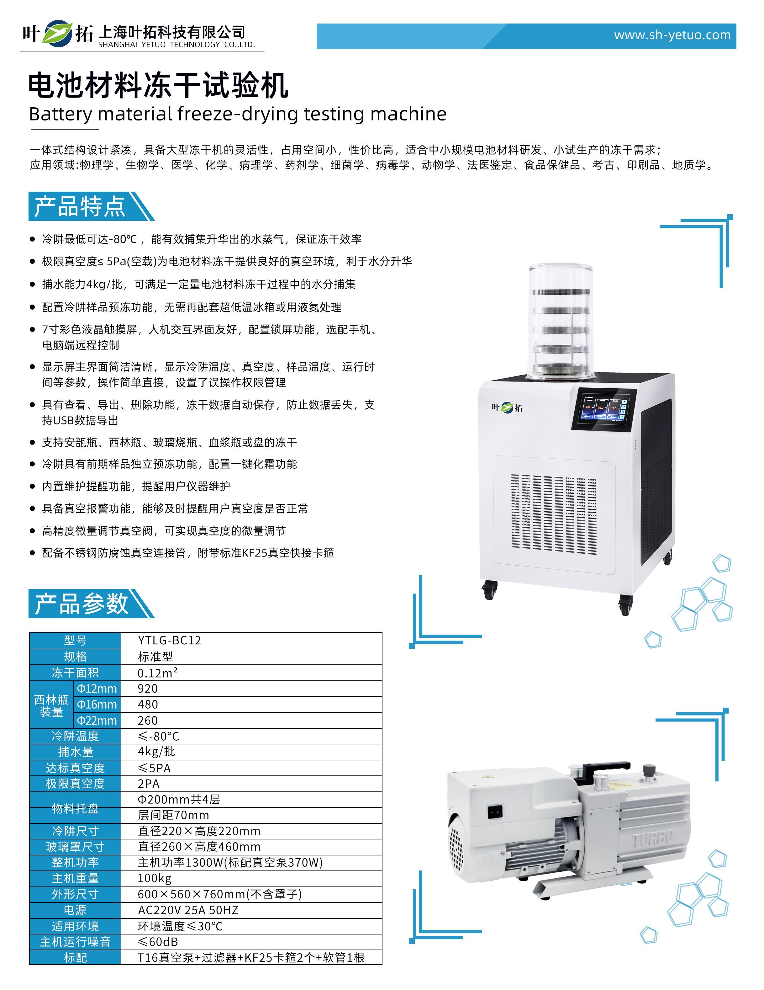 Product Features of YTLG-BC12 Battery Material Freeze Drying Testing Machine by Yetuo